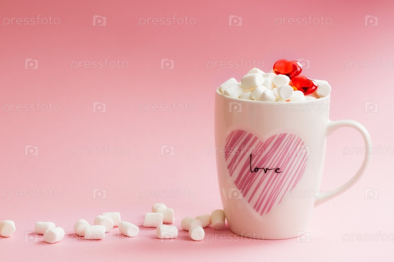 Баннер. Кружка со сладостями и зефиром на розовом фоне. Романтика, день святого валентина. Концепция праздника. Сезонный зимний февральский праздник, женщина, день матери