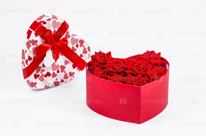 День Святого Валентина. Красные розы в белой коробке в виде сердца на белом фоне. Подарок женщинам на праздник. Концепция доставки цветов. флористика и цветочные магазины. Копировать пространство
