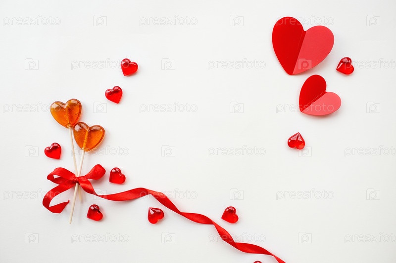 Баннер.Два сладости, красная лента и сердца на белом фоне. Красные сердца. Концепция конфетной любви. День святого Валентина. Копируйте место для надписи