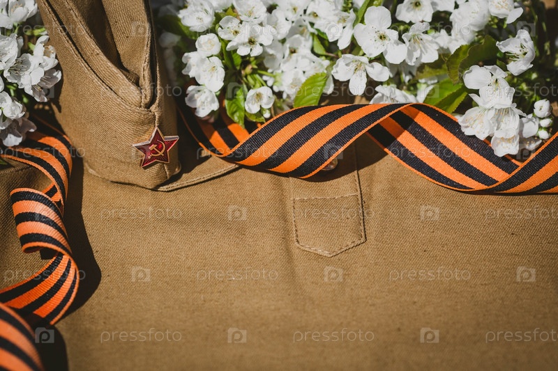 Знамя к 9 Мая. Военная форма, фуражка со звездой, георгиевской лентой и цветком сакуры на заднем плане. Концепция Дня Великой Победы 941-1945 гг. и Дня защитника Отечества