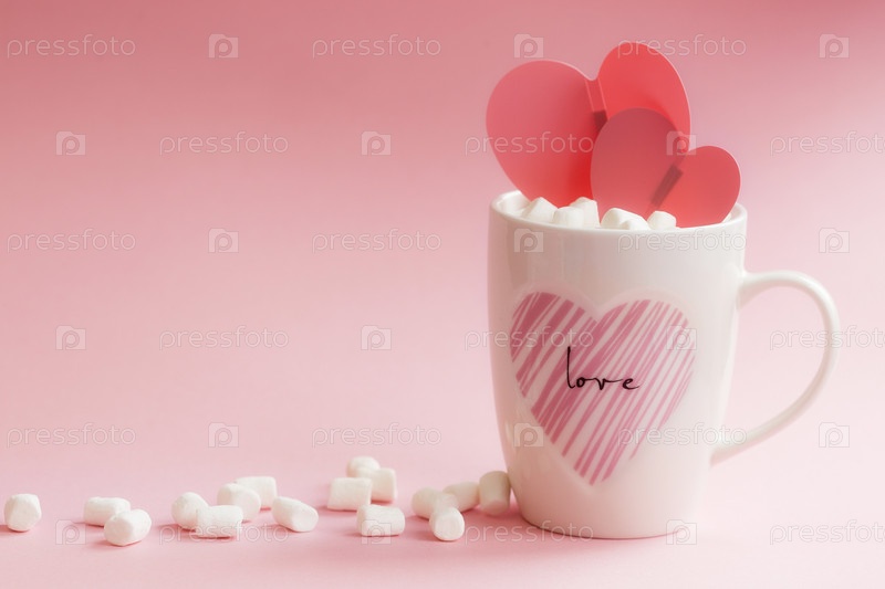 Баннер. Кружка со сладостями и зефиром на розовом фоне. Романтика, день святого валентина. Концепция праздника. Сезонный зимний февральский праздник, женщина, день матери