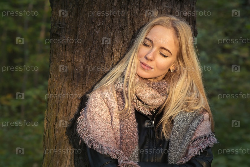 Счастливая блондинка с закрытыми глазами возле дерева, тонированное изображение