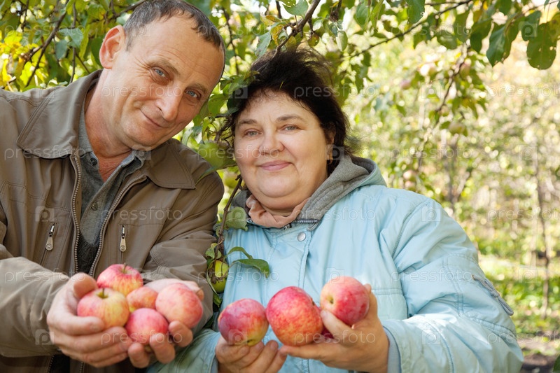 Пожилые мужчина и женщина с яблоками в руках