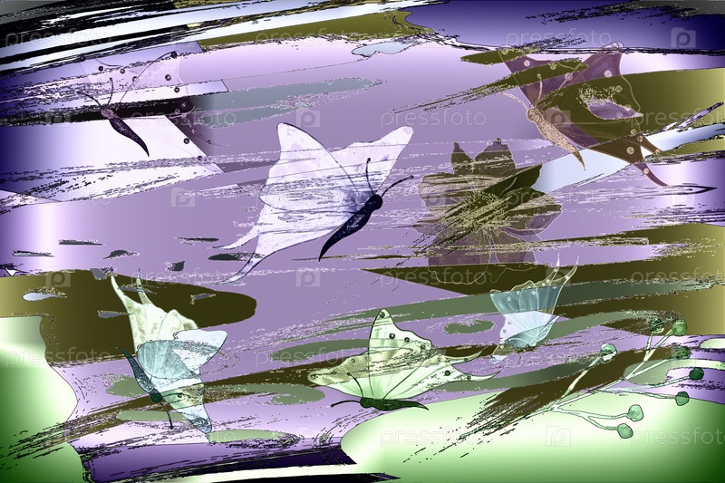 Абстрактное изображение: воздушные разноцветные бабочки и цветы