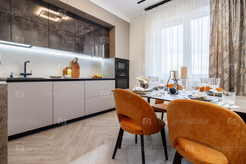 Современная кухня, объединенная со столовой в темных и светлых тонах, с оранжевыми стульями и стеклянными шкафчиками для посуды