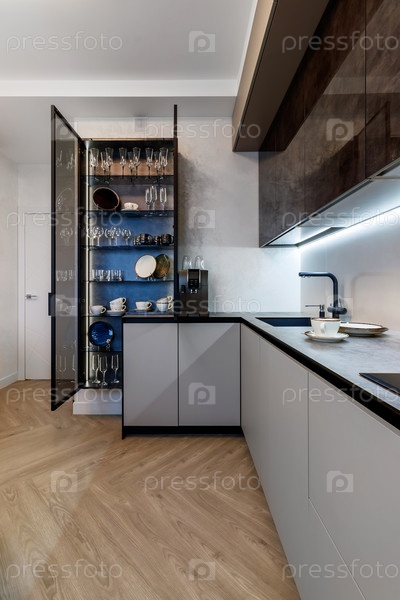 Современная кухня, объединенная со столовой в темных и светлых тонах, с оранжевыми стульями и стеклянными шкафчиками для посуды