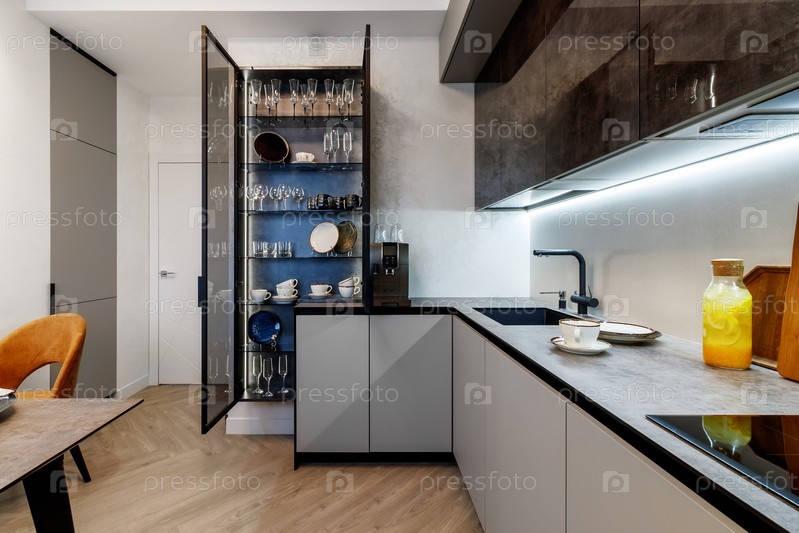 Современная кухня, объединенная со столовой в темных и светлых тонах, с оранжевыми стульями и стеклянными шкафчиками для посуды