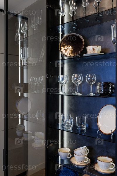 Современный стеклянный кухонный шкаф для хрустальных бокалов с желтой теплой подсветкой