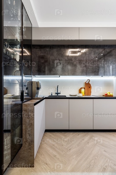 Современная кухня, объединенная со столовой в темных и светлых тонах, с оранжевыми стульями и стеклянными шкафчиками для посуды