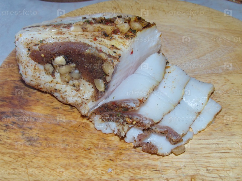Домашнее сало с приправами. Отличная закуска к рюмке холодной водки. Натуральная и здоровая пища. Крупным планом