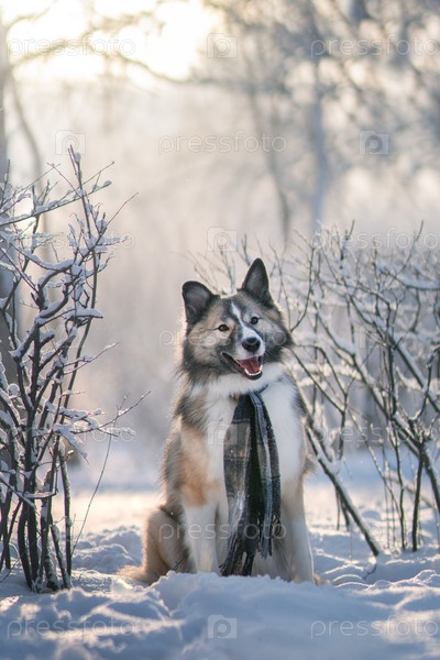 Собака в шарфе в зимнем парке