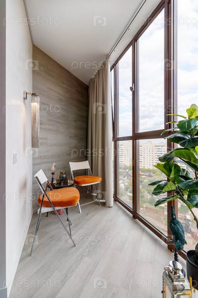 Небольшой чистый уютный балкон с окнами в крошечной городской квартире с растениями