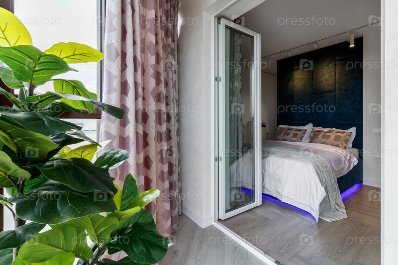 Натюрморт с пустой кроватью в гостиничном номере со стеклянными дверями патио, мягкими подушками