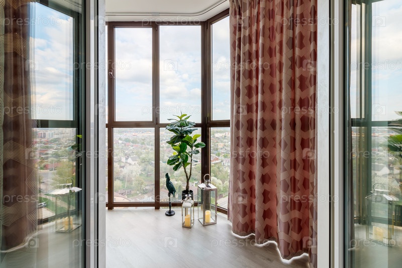 Небольшой чистый уютный балкон с окнами в крошечной городской квартире с растениями