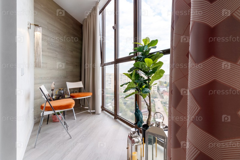 Небольшой чистый уютный балкон с окнами в крошечной городской квартире с растениями
