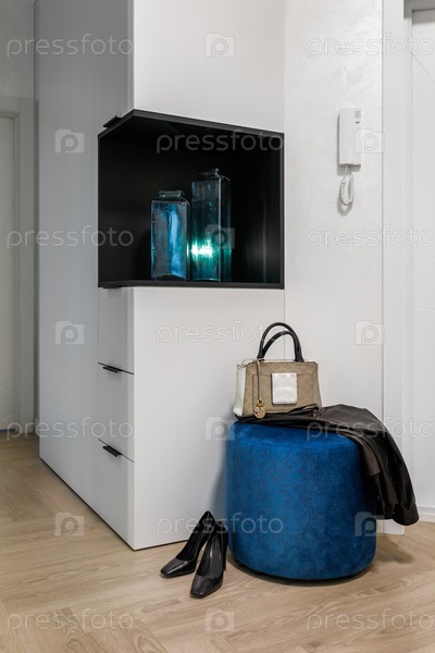 Вход в светлую современную квартиру с большой синей фреской на стене