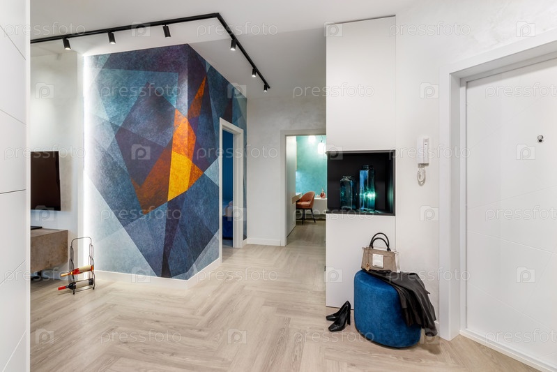 Вход в светлую современную квартиру с большой синей фреской на стене