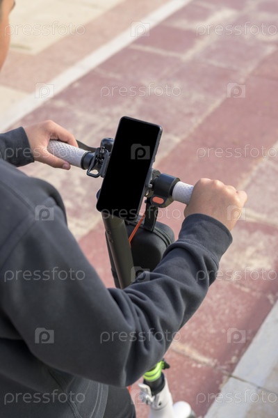 Молодой человек едет на электрическом скутере под открытым небом, просматривает маршрут в приложении карт для смартфона, концепция устойчивого транспорта, экологически чистая энергия с нулевыми выбросами CO2