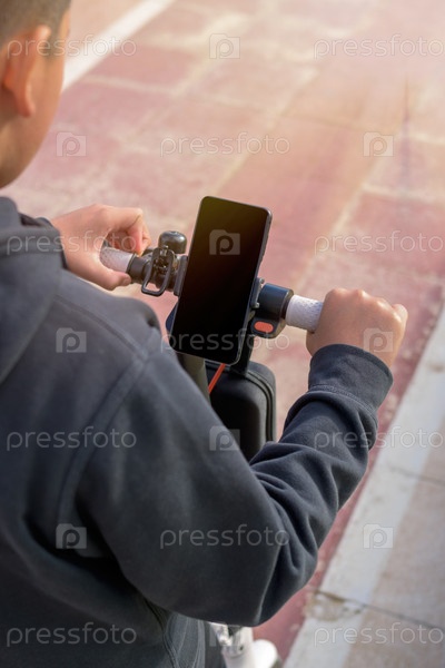 Молодой человек едет на электрическом скутере под открытым небом, просматривает маршрут в приложении карт для смартфона, концепция устойчивого транспорта, экологически чистая энергия с нулевыми выбросами CO2