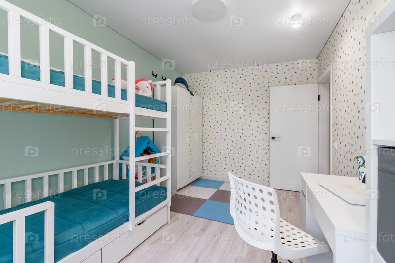 Двухъярусная кровать для ребенка с элементами декора, в современной квартире