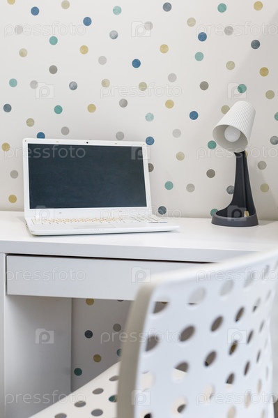 Рабочее место для ребенка со столом, ноутбуком и настольной лампой в современной квартире