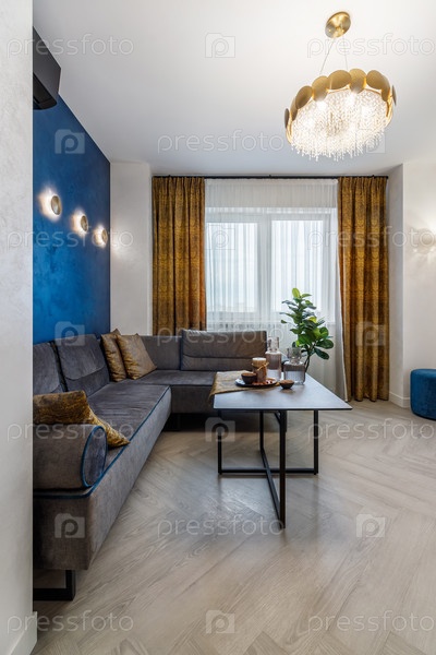 Современный интерьер гостиной роскошной гостиничной квартиры с дизайнерским диваном и художественными украшениями. Реальное фото