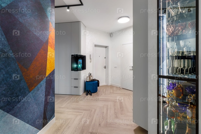 Вход в светлую современную квартиру с большой синей фреской на стене