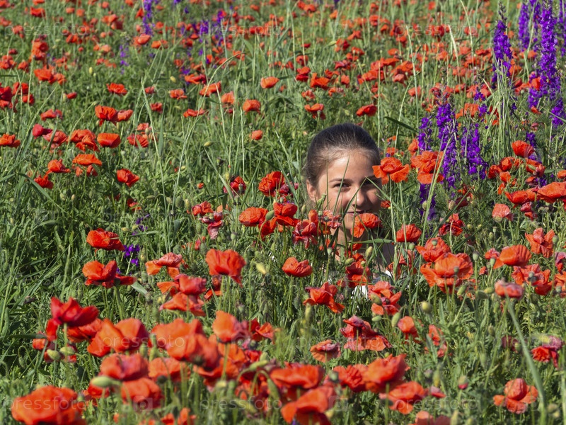 Красивое цветочное маковое поле, в котором сидит счастливая девушка и наслаждается видом и ароматом. Красота природы