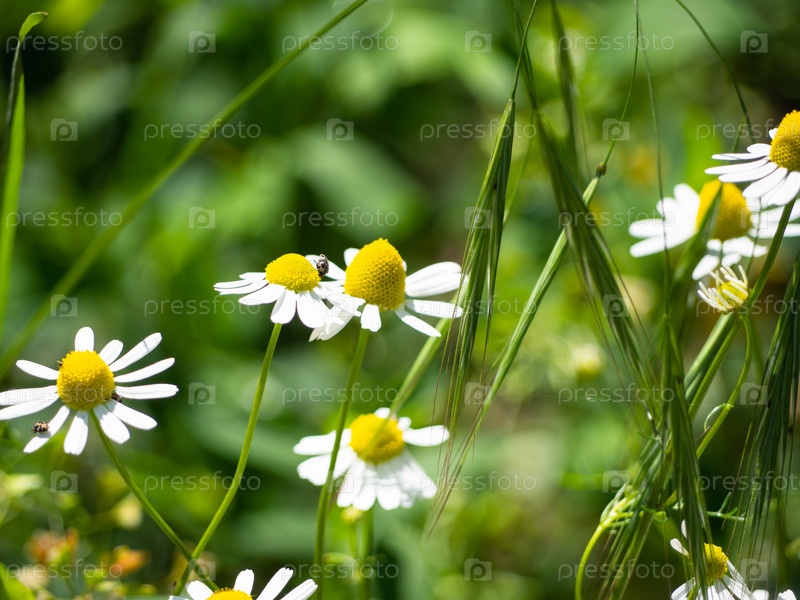 Цветки маргариток, по которым ползают насекомые, и колоски диких зеленых трав. Природная, экологически чистая среда