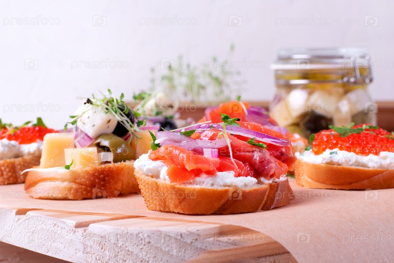 Ассорти брускетт с соленой форелью, красным луком, сливочным сыром, красной икрой, маринованным сыром и микрозеленью подается на деревянной доске. Набор закусок с различными начинками