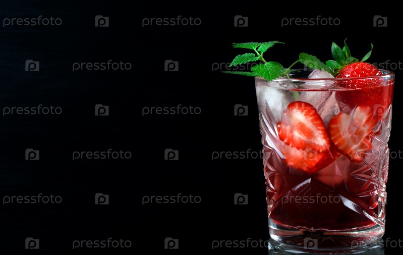 Клубничный алкогольный напиток с ликером, кубиками льда и мятой в стакане на черном. Копировать пространство