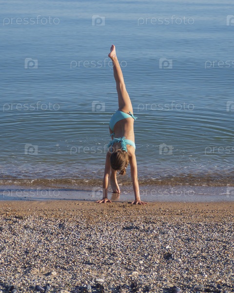 Девочка-подросток занимается гимнастикой на пляже у кромки воды. Девушка в голубом купальнике на песчаном пляже у лазурного моря. Фитнес на свежем воздухе и здоровый образ жизни