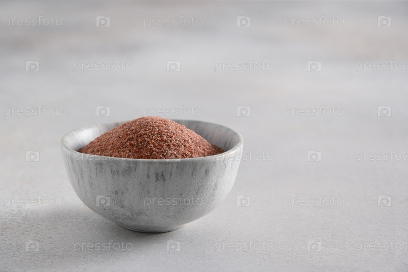 Индийская гималайская черная соль, Кала намак в миске на сером фоне. Приправа для вегетарианцев и индийской кухни. Закрыть. Скопируйте пространство