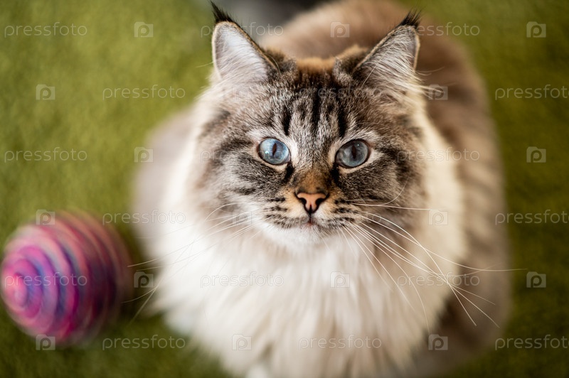 Пушистый кот с голубыми глазами сидит дома на зеленом ковре. Перед ним большой разноцветный шар