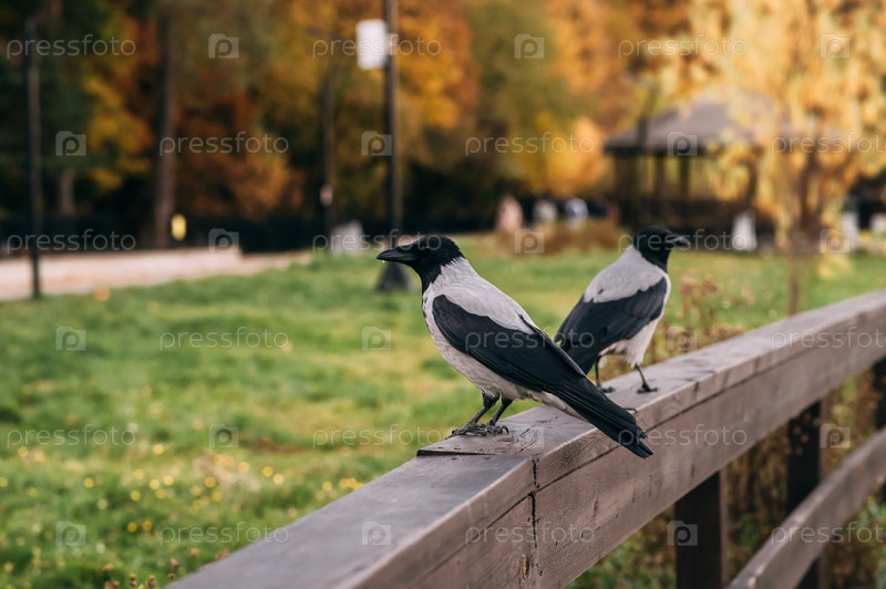 Вороны сидят на деревянном мосту. Вороны серые и черные
