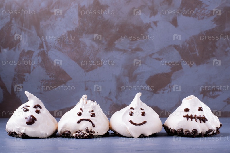 Смешные безе-призраки со смешными лицами на сером столе. Хеллоуинский десерт. Копировать пространство