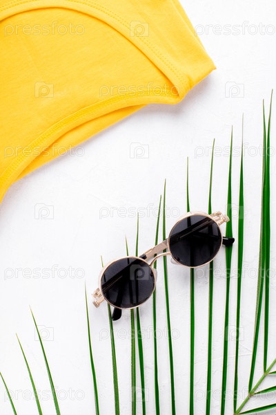 Круглые солнцезащитные очки, пальмовый лист и желтая футболка на белом. Летняя модная квартира