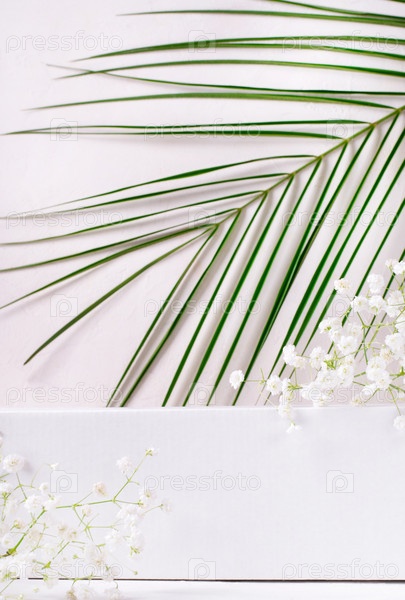 Шаблон для презентации продукта с белым подиумом, гипсофилой и пальмовым листом