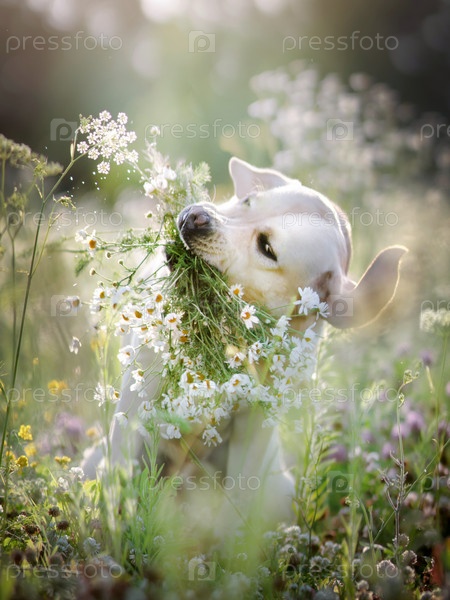 Лабрадор собака. Поле ромашек