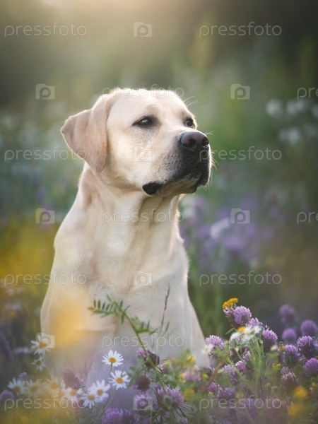 Лабрадор собака. Поле ромашек