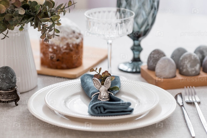 Весенняя сервировка стола. Тарелка с хлопковой салфеткой с зайчиком, тортом и пасхальными яйцами. Столовое серебро, пасхальные кролики и ваза с цветами на льняной скатерти. Концепция светлого праздника Пасхи