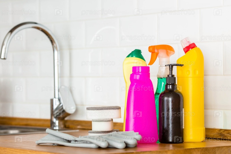 Чистящие средства на деревянном столе с размытым фоном современной кухни. Красочный набор для стирки с копировальным местом для текста