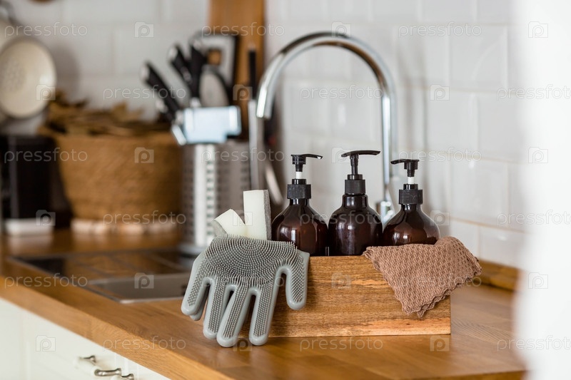 Деревянная коробка с чистящими средствами, перчатками, губками на современном деревянном столе