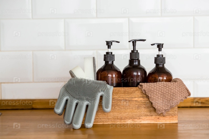 Деревянная коробка с чистящими средствами, перчатками, губками на современном деревянном столе