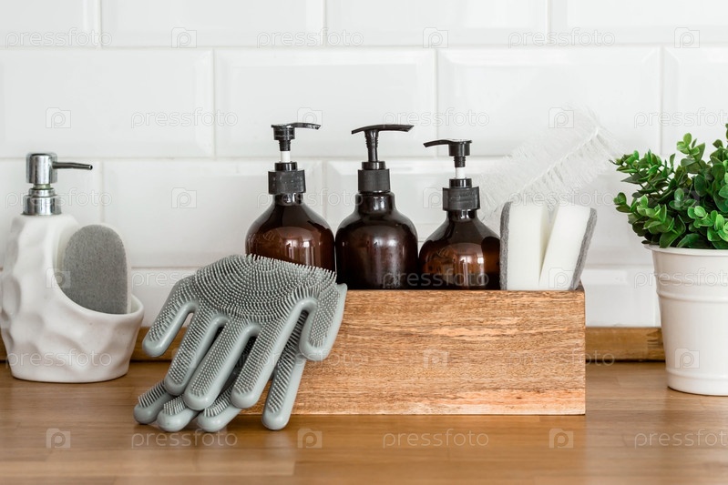 Деревянная коробка с чистящими средствами, перчатками, губками на современном деревянном столе