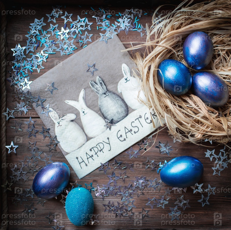 Голубые пасхальные яйца в гнезде на деревянном фоне. Минимальная пасхальная концепция. Пасхальная открытка с местом для копирования текста