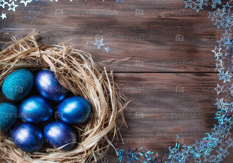 Голубые пасхальные яйца в гнезде на деревянном фоне. Минимальная пасхальная концепция. Пасхальная открытка с местом для копирования текста