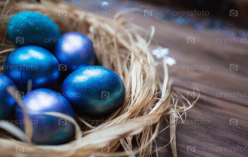 Голубые пасхальные яйца в гнезде на деревянном фоне. Минимальная пасхальная концепция. Пасхальная открытка с местом для копирования текста