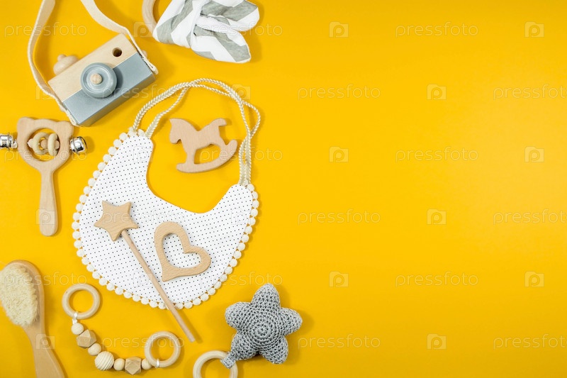 Нагрудник и деревянные игрушки. Набор детских вещей и аксессуаров для девочки на желтом фоне. Понятие детской души. Модный новорожденный. Плоская кровать, вид сверху