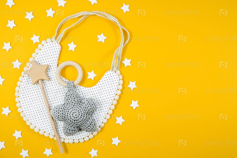 Нагрудник и деревянные игрушки. Набор детских вещей и аксессуаров для девочки на желтом фоне. Понятие детской души. Модный новорожденный. Плоская кровать, вид сверху
